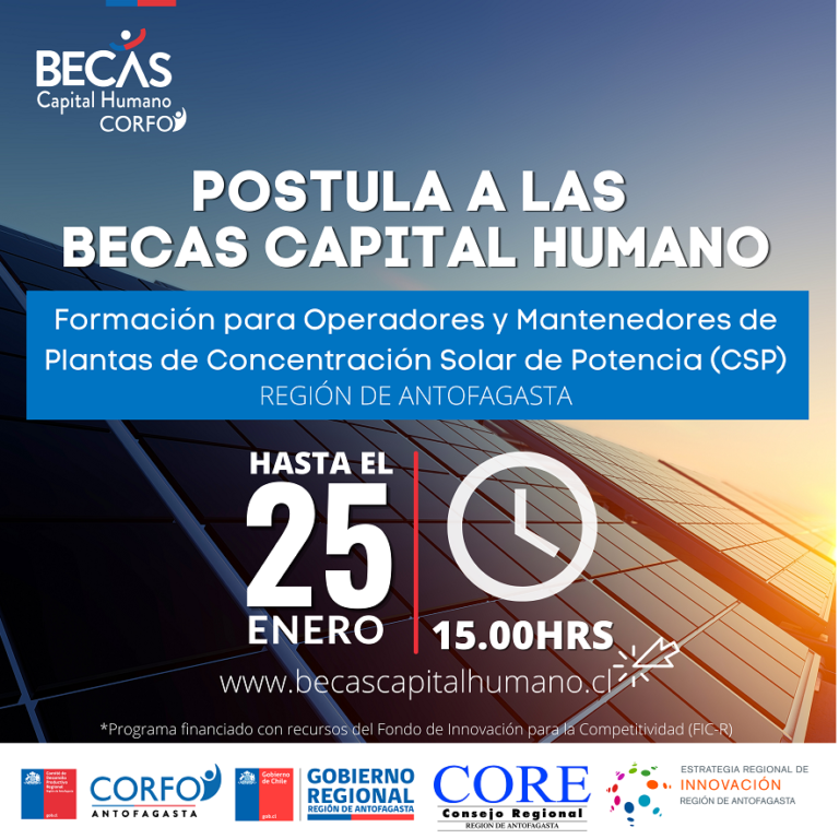 Cupo para formar 55 profesionales y/o técnicos especializados en mantención y operación de plantas de Concentración Solar de Potencia (CSP) para el mercado de la región de Antofagasta, en base…