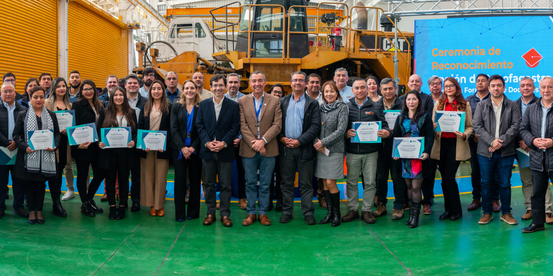 En las dependencias del Taller de Equipo Pesado del Centro de Entrenamiento Industrial y Minero -CEIM, se realizó la ceremonia de reconocimiento a 42 colaboradores(as) que culminaron exitosamente su aprendizaje en el Programa Formativo de Docentes “Gestión por Competencias”, otorgado por la Red CCM Eleva y que consiste en una capacitación de 80 horas pedagógicas a actores relevantes de instituciones formadoras, para que puedan desarrollar experiencias de implementación del sistema de cualificaciones alineadas al Marco de Cualificaciones Técnico Profesional (MCTP) y al Marco de Buenas Prácticas para la Formación en Minería (MBPF), estándares de calidad fundamentales para cumplir con las exigencias necesarias para la formación de capital humano en la industria minera 4.0.